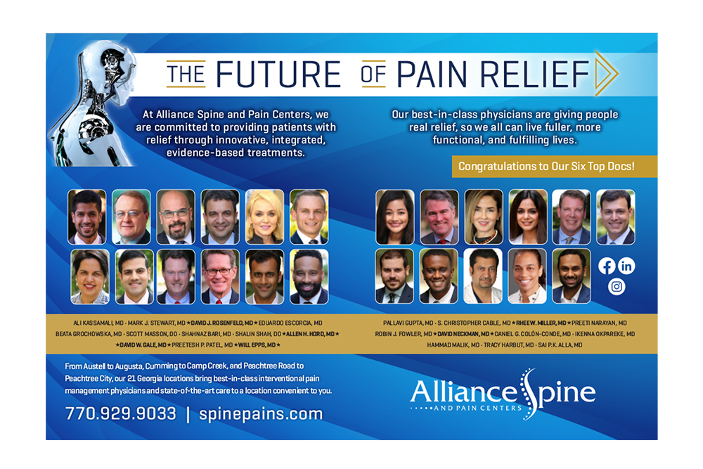 The list includes physicians from Alliance Spine and Pain Centers, Atlanta Allergy & Asthma, Avant Gynecology, Eye Consultants of Atlanta, Georgia Urology, Marietta Plastic Surgery, Olansky Dermatology & Aesthetics, and Vascular Surgical Associates.